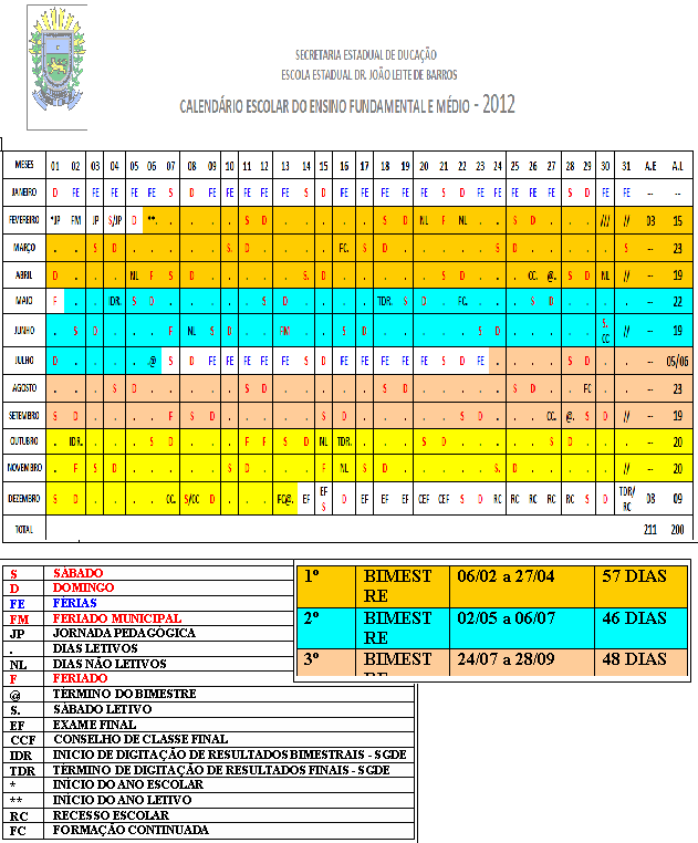 CALENDÁRIO ESCOLAR 2012 - JOÃO LEITE DE BARROS